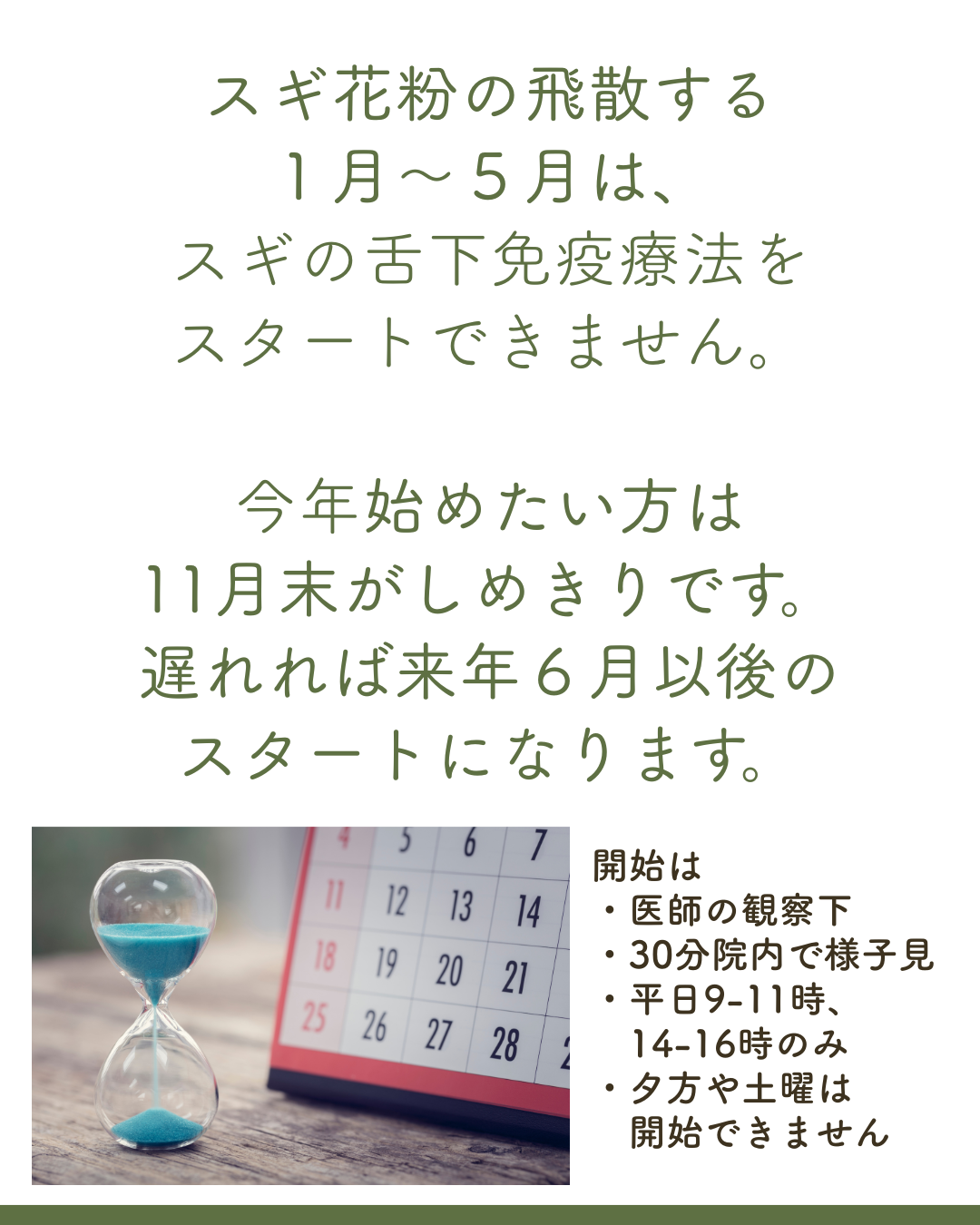 スギ花粉は1月~5月に飛散するため、この間はスギ花粉の舌下免疫療法のスタートはできません。