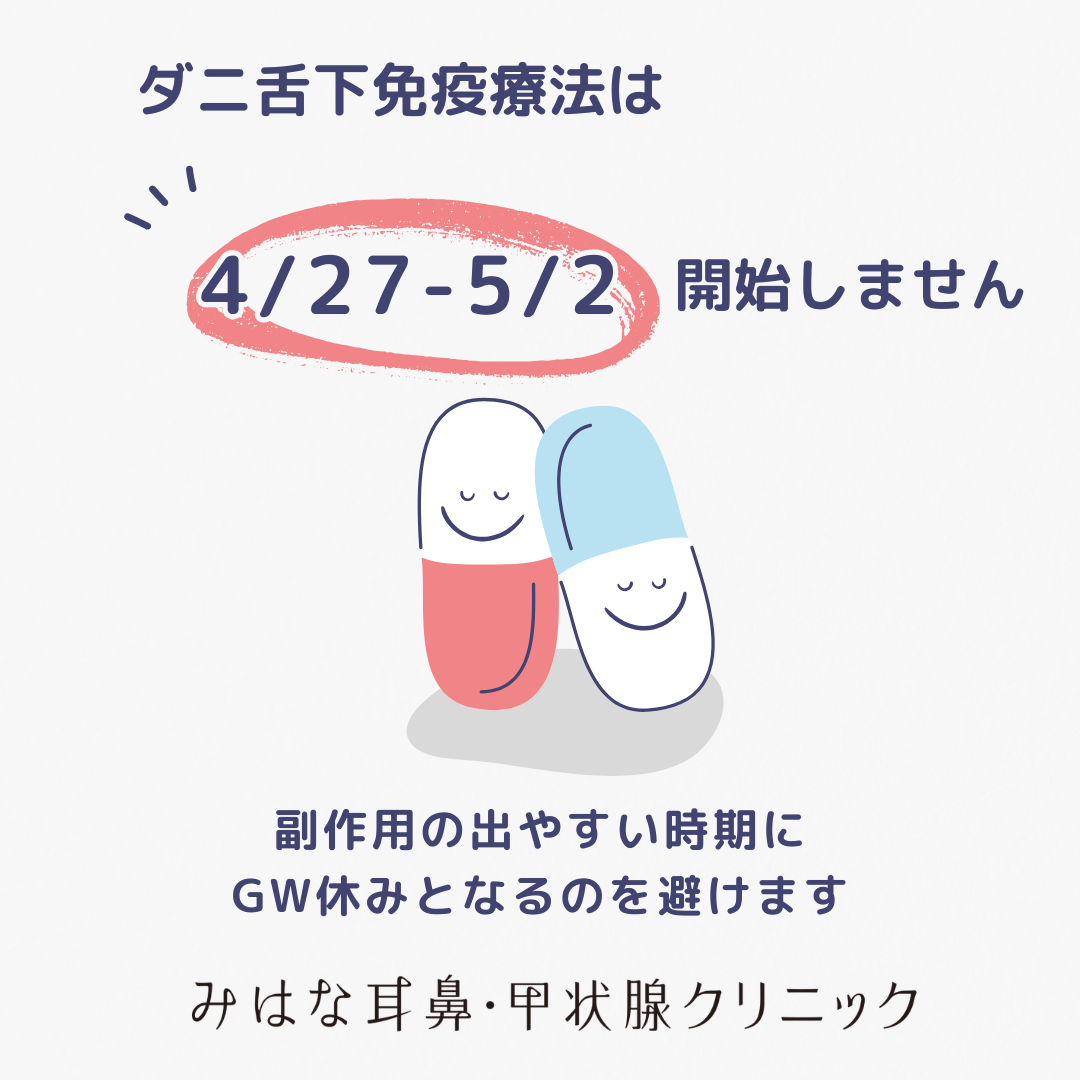 「ゴールデンウィーク前一週間」は舌下免疫療法はスタートできません。